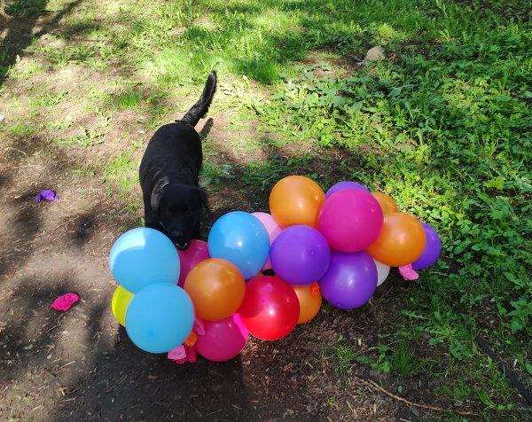 Описание под фото: Локки обожает воздушные шары. На одной из прогулок мы нашли это чудо, которое осталось от праздника. Весело бегали и лопали шары. Пес был в восторге
